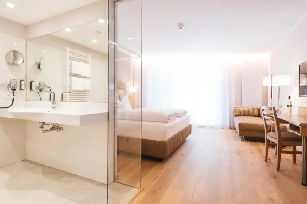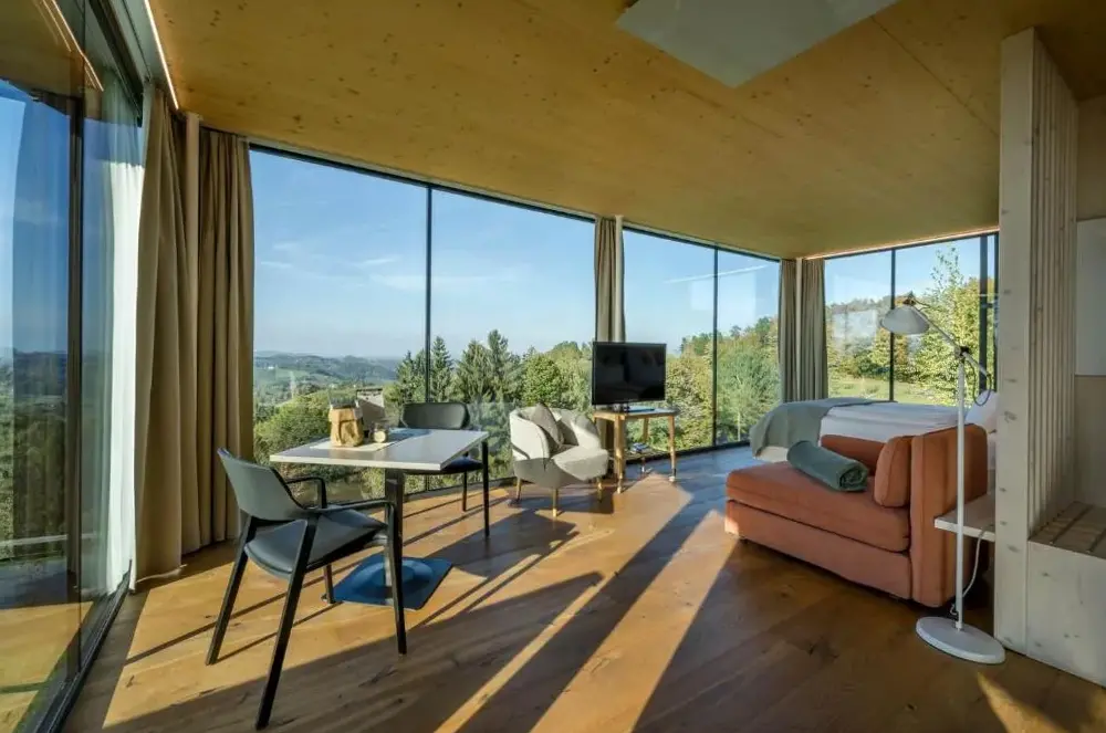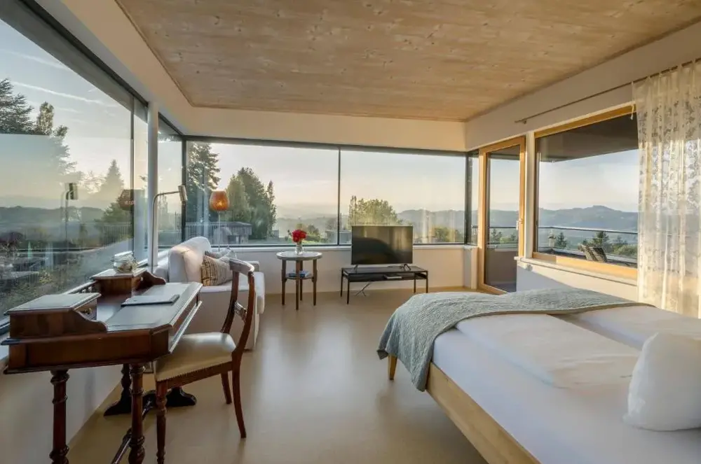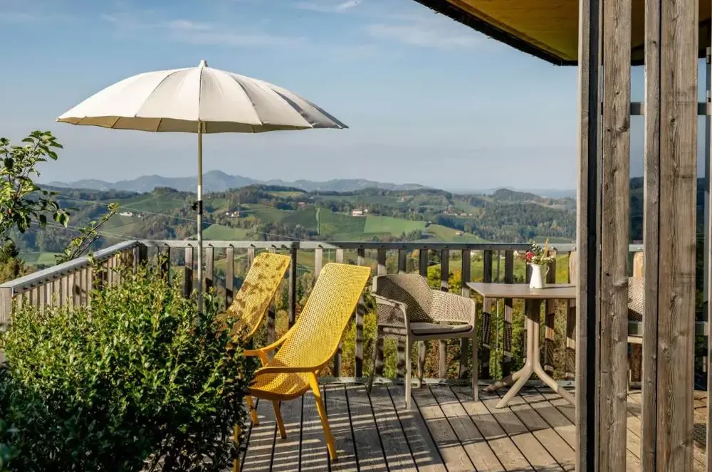 关于 Ferienwohnung Modi 的更多信息位于奥地利施蒂利亚南部山坡上的WURZENBERG Hotel Lodges Südsteiermark,坐落在塞尔瑙(Sernau)的富特沙赫村庄(Fötschach 102),周边环绕着葡萄园和林木,景观开阔且视野全面。酒店整体设计精致、现代化,每个角落都透露出用心打造的品质——从庭院中的花草布局到室内装饰无不彰显考究。游客可在宽敞明亮的户外空间中享受宁静氛围,远离尘嚣,同时也能欣赏到360度无死角的大自然风光。住宿期间,早餐服务更是独具匠心:无论选择房间送餐还是自助式“早餐盒”,均由当地优质原料精制而成,口感鲜美实惠。此外,酒店还提供专为残障友好设计的设施以及免费停车场等便利条件,确保入住舒适无忧。附近距离格拉茨机场约32公里、雷德万杰滑雪索道18公里、埃伦豪森城堡仅8公里之遥,交通便捷又兼顾休闲度假需求。